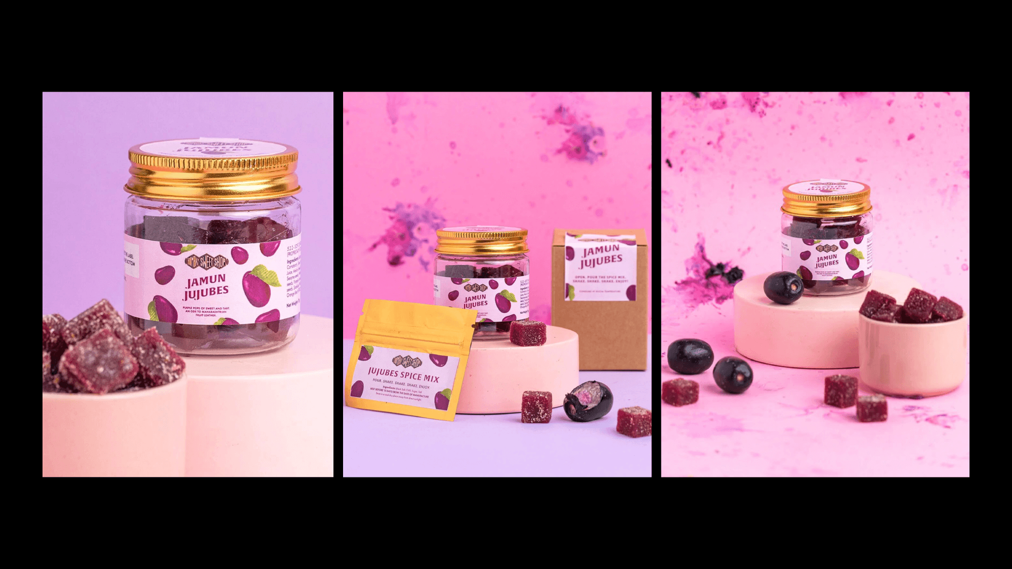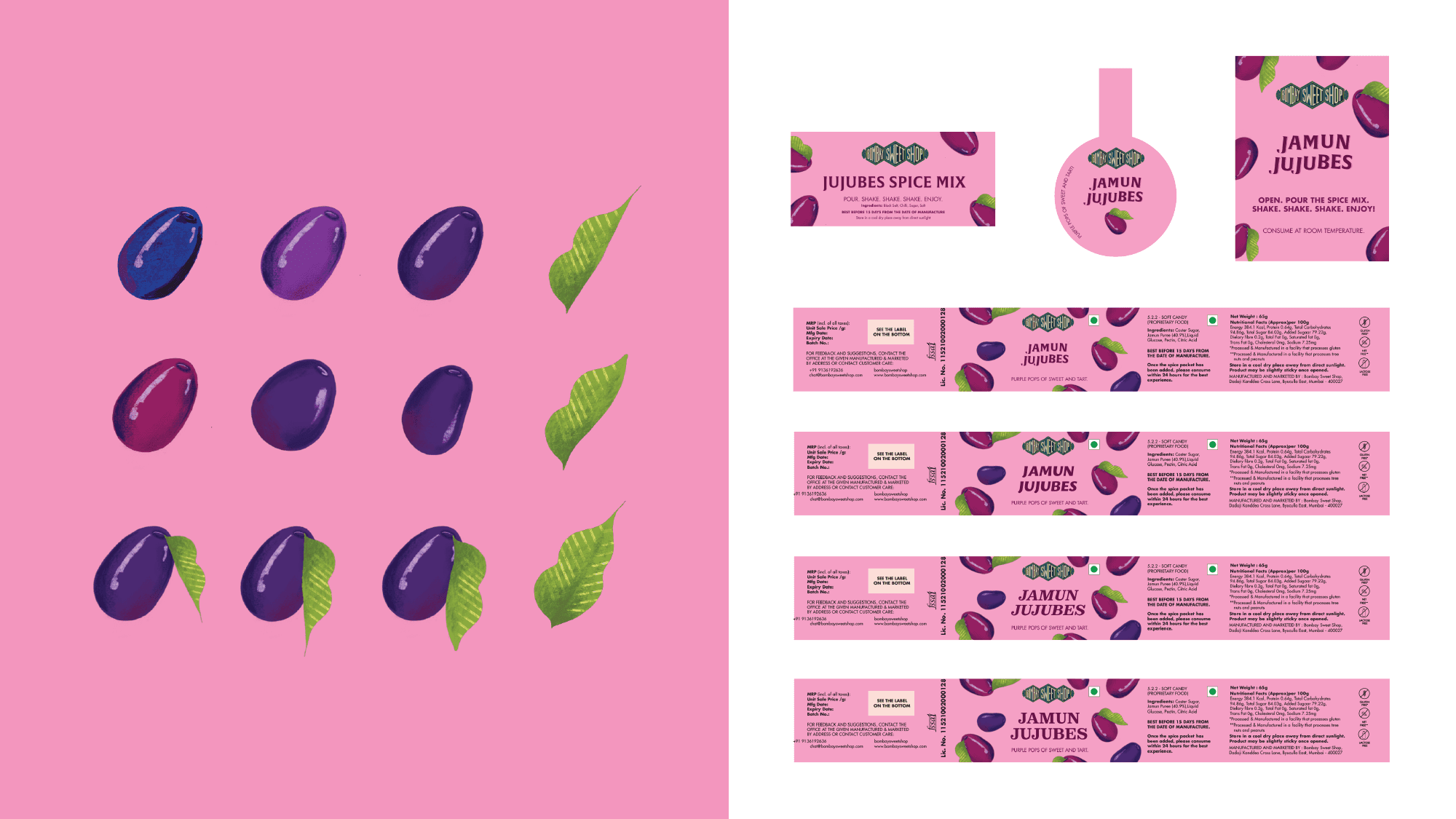 For the Jamun Juju’s packaging, the client wanted to capture the essence of crushed jamuns on the road and translate that feeling into the packaging design. However, we had to consider constraints such as the small package size and the existing layout from the previous year’s summer season candy. Our explorations were guided by these limitations while ensuring the concept was effectively conveyed.